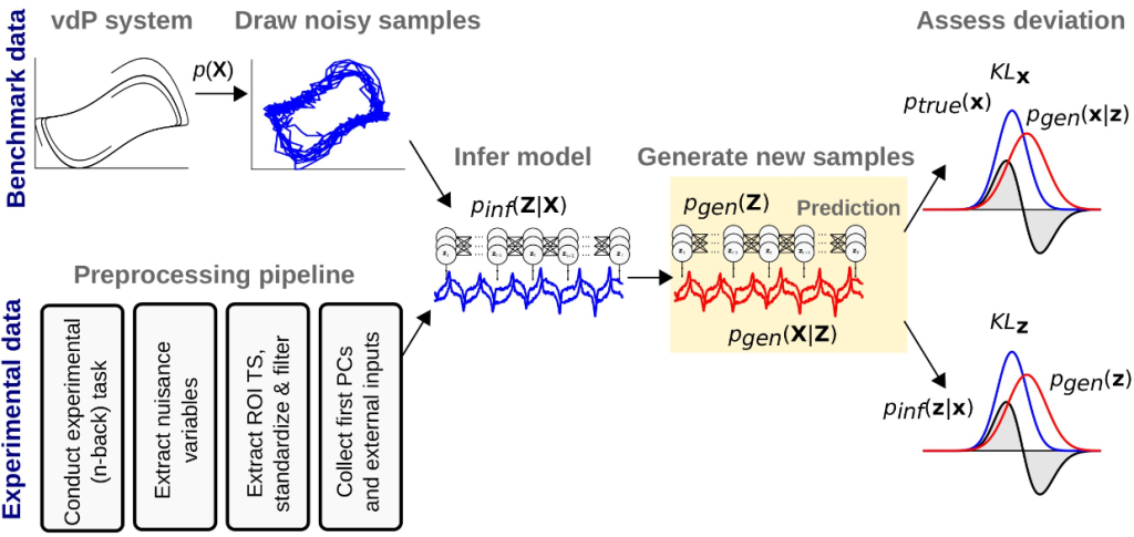 Other projects deal with diagnosing and refining psychiatric and neurological conditions (e.g. Thome et al. 2022, Durstewitz et al. 2021) based on dynamical systems features extracted from neuroimaging data (partly together with the group of Prof. Emanuel Schwarz), predicting tipping points toward sepsis in intensive care unit (ICU) patients (together with Prof. Verena Schneider-Lindner; within AI Health Innovation Cluster), or inferring dynamical signatures of anesthesia depth from electrophysiological recordings and Ca2+ imaging (with Prof. Simon Wiegert within AI Health Innovation Cluster), all based on our NFO/DSR architectures.