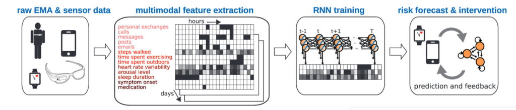 In collaboration with groups at the Central Institute of Mental Health in Mannheim (in particular the Dept. of Public Mental Health led by Prof. Ulrich Reininghaus) and international partners, we work on various problems relevant to psychiatry and mental health prevention. One set of projects situated within the DFG TRR-265 on drug addiction, the European consortium IMMERSE and an AI Living Lab on mental health prevention in younger adults, is concerned with predicting behavioral trajectories from mobile data and ecological momentary assessments (EMAs; e.g. Durstewitz et al. 2019, Fechtelpeter et al. 2023). This serves to identify maladaptive behavioral patterns, or predict tipping points toward such behavior, and provide according feedback to the subjects, or to select optimal momentary ecological interventions (EMIs) from a repertoire of coping strategies in control loops with the subjects.
